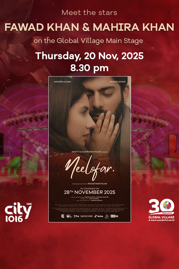A truly unforgettable evening is waiting for you at Global Village. On Thursday, 20 November at 8:30 PM, you will meet your beloved stars Fawad Khan and Mahira Khan as they appear live for the special launch of their new film “Neelofer.”