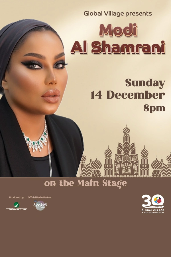 An exceptional Khaleeji night will unfold at Global Village as the Main Stage welcomes the soulful voice of Modi Al Shamrani for a live concert that promises to captivate guests with authentic Saudi melodies and vibrant rhythms, Taking place on 14 December at 8:00 PM on the Main Stage, this concert will offer a memorable opportunity to enjoy an enchanting musical journey under the lights of Global Village, surrounded by an energetic crowd and an ambiance that transforms the evening into a true celebration of Khaleeji music and unforgettable moments.