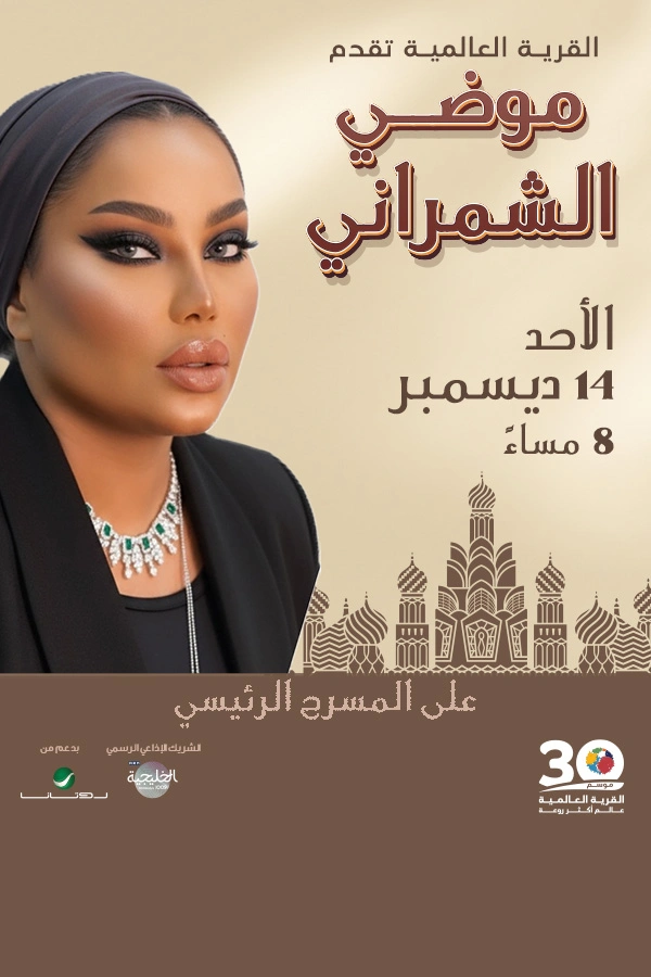 ستنطلق في القرية العالمية ليلة خليجية ساحرة لا تُنسى، حيث ستأسر الفنانة موضي الشمراني خشبة المسرح الرئيسي بحفل غنائي مباشر يأخذ الضيوف في رحلة مليئة بالإيقاعات النابضة والحان الموسيقى السعودية الأصيلة استعدوا لأمسية غنائية استثنائية تحت أضواء القرية العالمية، حيث تتعانق الموسيقى والذكريات لتترك بصمة خالدة في قلب كل ضيوفنا الكرام يوم 14 ديسمبر في الساعة 8:00 مساءً على المسرح الرئيسي،
