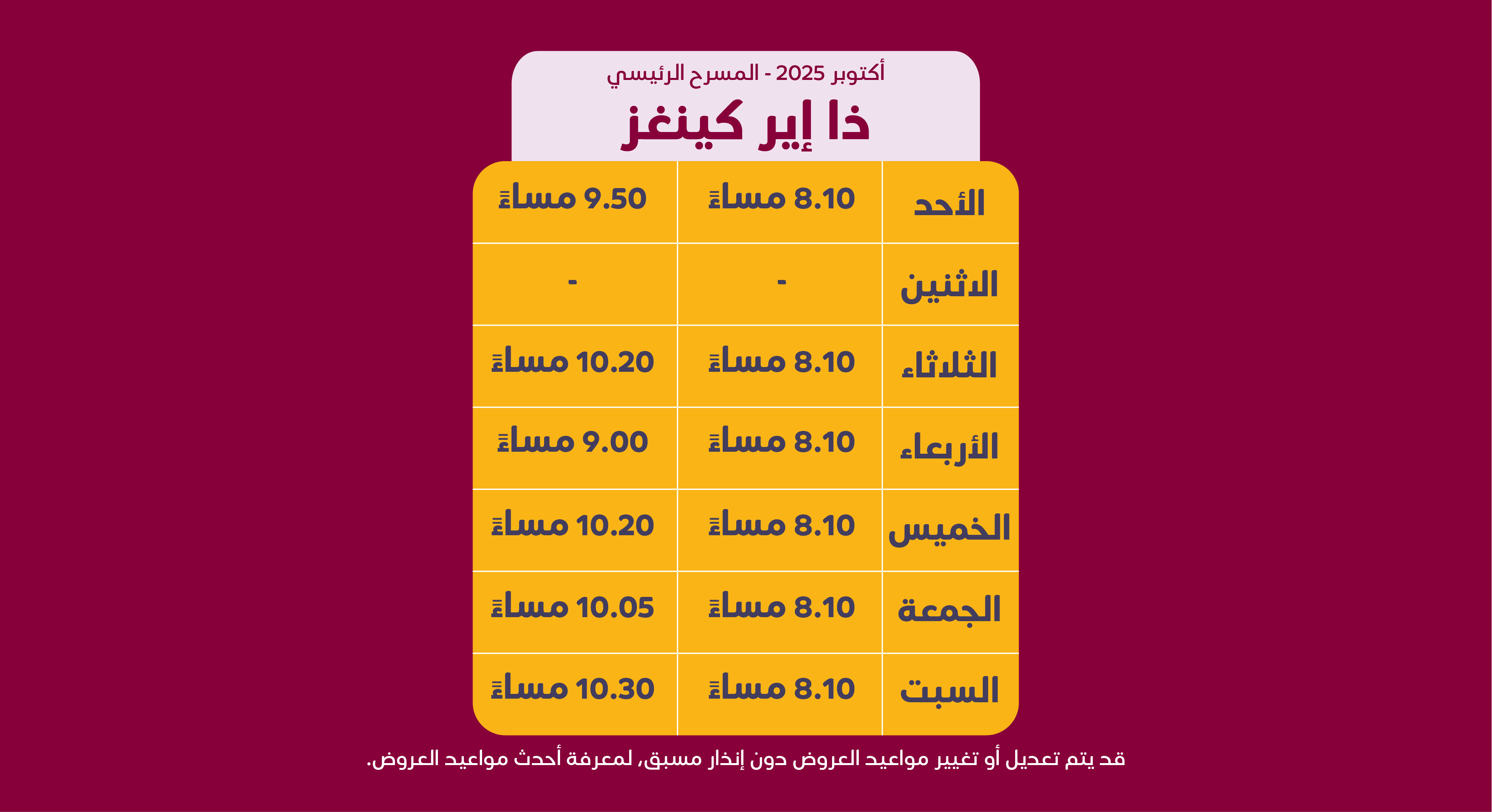 استعدوا للانبهار مع ذا إير كينغز، عرض مليء بالطاقة يجمع بين رقص البريك دانس والحركات الأكروباتية المذهلة. شاهدوا هؤلاء المؤدين الرائعين وهم يتحدّون الجاذبية بحركاتهم السريعة والبهلوانية المذهلة التي تتخطى كل التوقعات. إنه مزيج من الإيقاع والقوة والحماس في عرض لا يُنسى على المسرح الرئيسي.