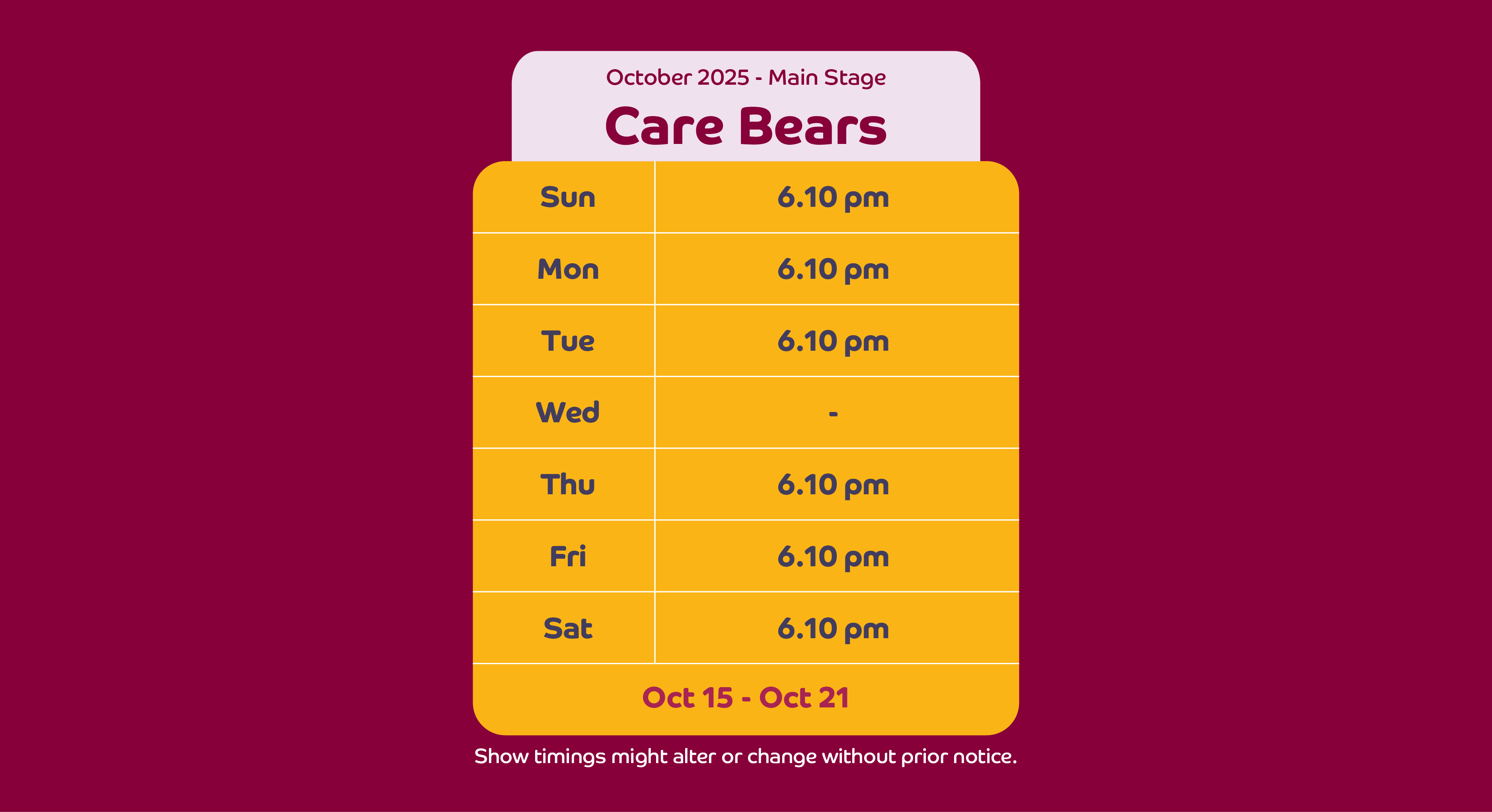 3,2,1... it's time for Care Bears – Unlock the Magic! Featuring Care Bear favourites Grumpy, Funshine and Cheer, plus a special on-screen appearance from Tenderheart and the baddie that everyone loves to hate. Bluster, this is an 80's flashback the whole family will enjoy! Does nice triumph over naughty? Find out in this fun family show, full of singing, dancing, and that classic Care Bear magic!