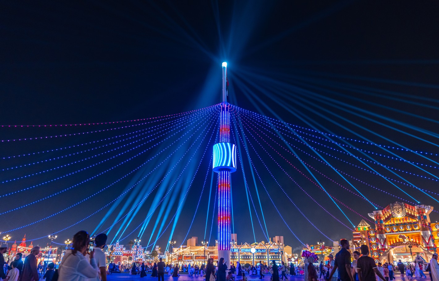 شاهدوا روعة الأضواء في عرض الأضواء الذي يُقام في قلب القرية العالمية أمام المسرح الرئيسي!