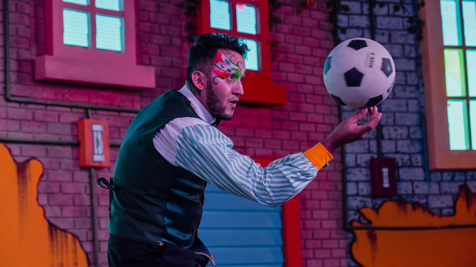ادخلوا إلى عالم الضحك والمرح مع عرض 'العاب المهرجون' على مسرح الأطفال.
