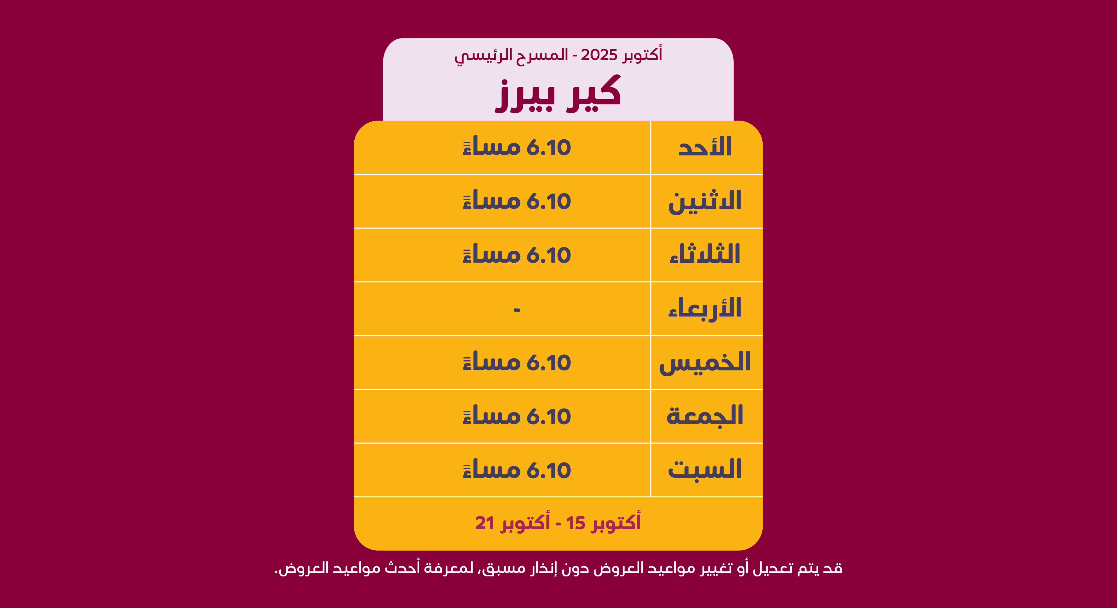 ثلاثة، اثنان، واحد... حان وقت كير بيرز - ادخلوا إلى عالم السحر! تشارك في هذا العرض الشخصيات المفضلة من دببة كير بيرز: غرامبي وفان شاين وشير، بالإضافة إلى ظهور تندر هارت على الشاشة والشخصية الشريرة التي يحبها العديد، إنها واحدة من كلاسيكيات الثمانينيات التي يعشقها كل أفراد الأسرة! فهل ينتصر المهذب على اللعوب؟ ستعرفوا إجابة هذا السؤال عند مشاهدة هذا العرض الفني العائلي الذي يجمع بين الغناء والرقص والحنين إلى الماضي المتجسد في شخصيات كير بيرز!